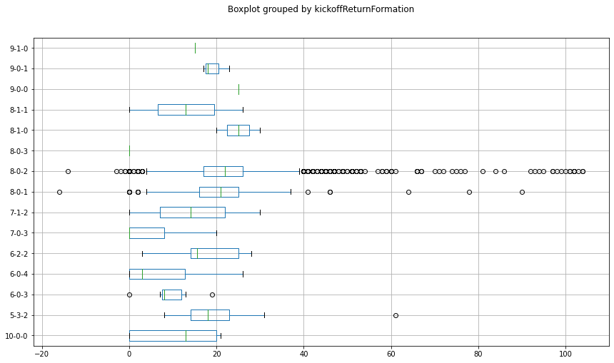 ax = kickoff_returns_df[['kickoffReturnFormation', 'kickReturnYardage']].boxplot(by='kickoffReturnFormation', figsize=(14,8), vert=False)#绘制开球回攻盒线图