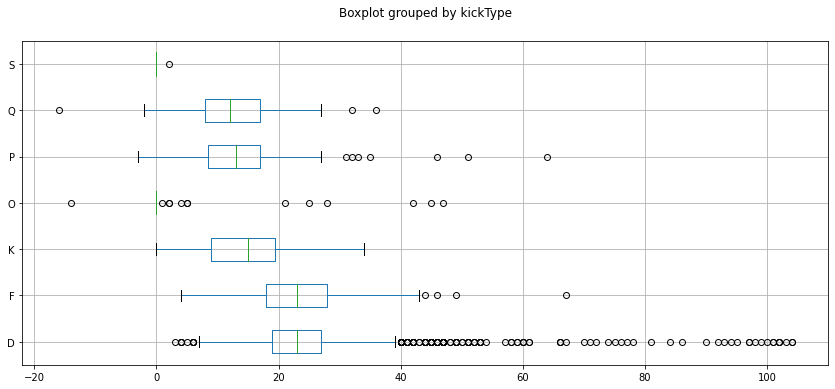 ax = kickoff_returns_df[['kickType', 'kickReturnYardage']].boxplot(by='kickType', figsize=(14,6), vert=False)#绘制开球回攻盒线图