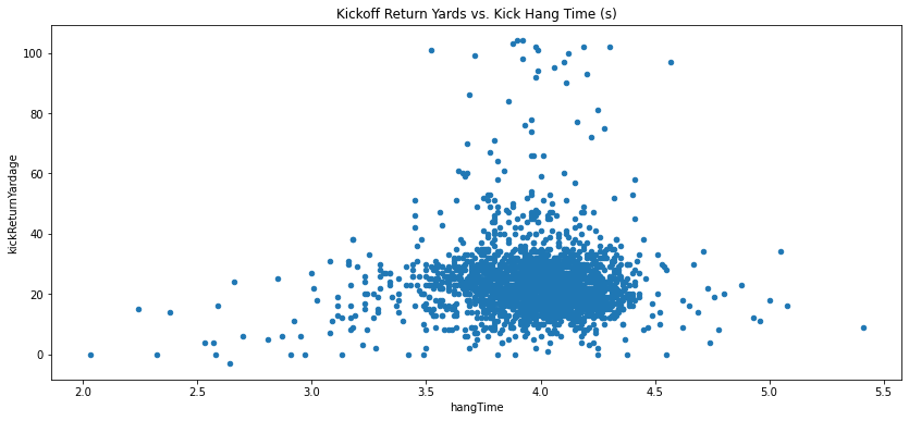 kickoff_returns_df.plot.scatter(x='hangTime', y='kickReturnYardage', figsize=(14,6), title="Kickoff Return Yards vs. Kick Hang Time (s)")#绘制开球回攻散点图