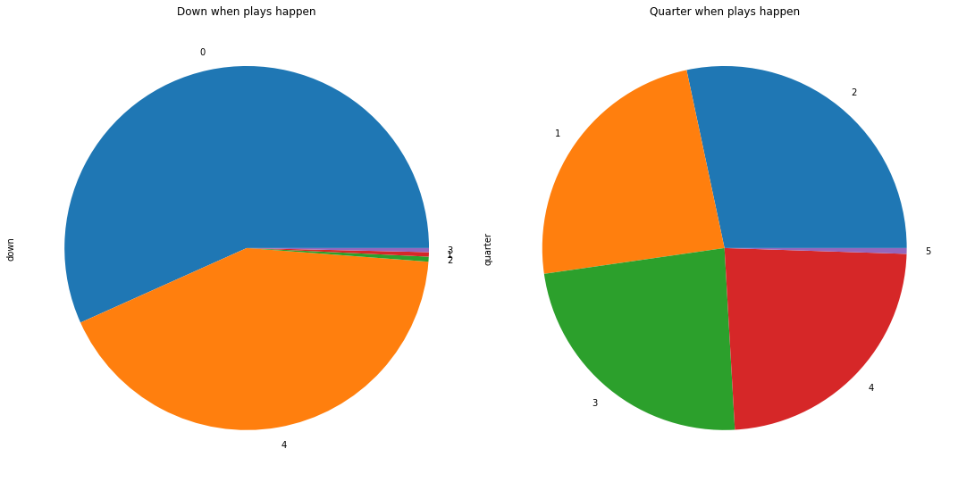 plays_df.quarter.value_counts().plot.pie(title='Quarter when plays happen', ax=ax2)