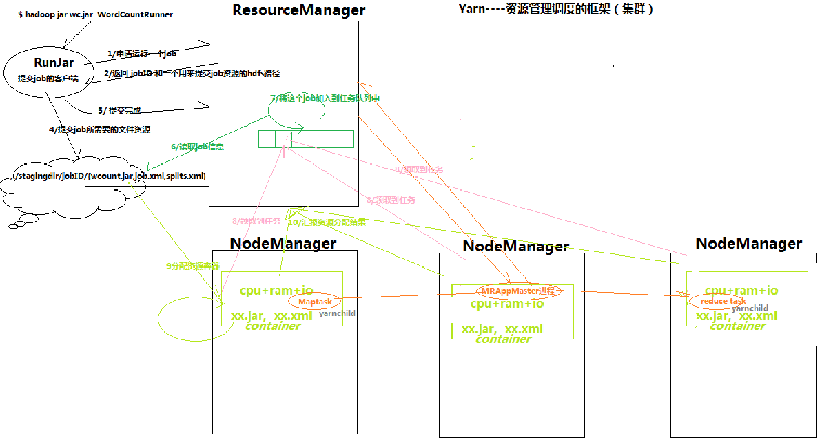 RunJarRunJar向Yarn中的ResourceManager申请运行一个job , ResourceManager返回执行job的 "jobId" 和 "存放job资源的hdfs路径"Runjar将job需要的文件资源(jar包,jobid,jar存放的位置,配置信息等等)写入HDFS,通知ResourceManager提交完成ResourceManager读取HDFS上的job信息,开始初始化一个Job任务,并将其放入任务队列NodeManager读取ResourceManager的任务队列,发现对应任务分配给自己时,领取任务信息(心跳机制)NodeManager根据任务信息,下载所需要的jar包,分配执行job的资源容器。分配完毕后向ResourceManager汇报分配结果ResourceManager根据各个机器的分配结果,选取一个机器上的NodeManager运行MapReduce的主管进程:MRAppMasterMRAppMaster主进程协调其余NodeManager一起运行MapReduce程序来完成job任务,并将结果写入HDFS对应目录整个过程也可以简化为以下三步: