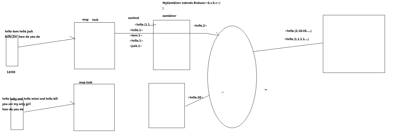 通过在combiner中对MapperTask的长哈希map进行累加处理得<hello,100000>,再传给Shuffle,将减少它大量的IO工作。