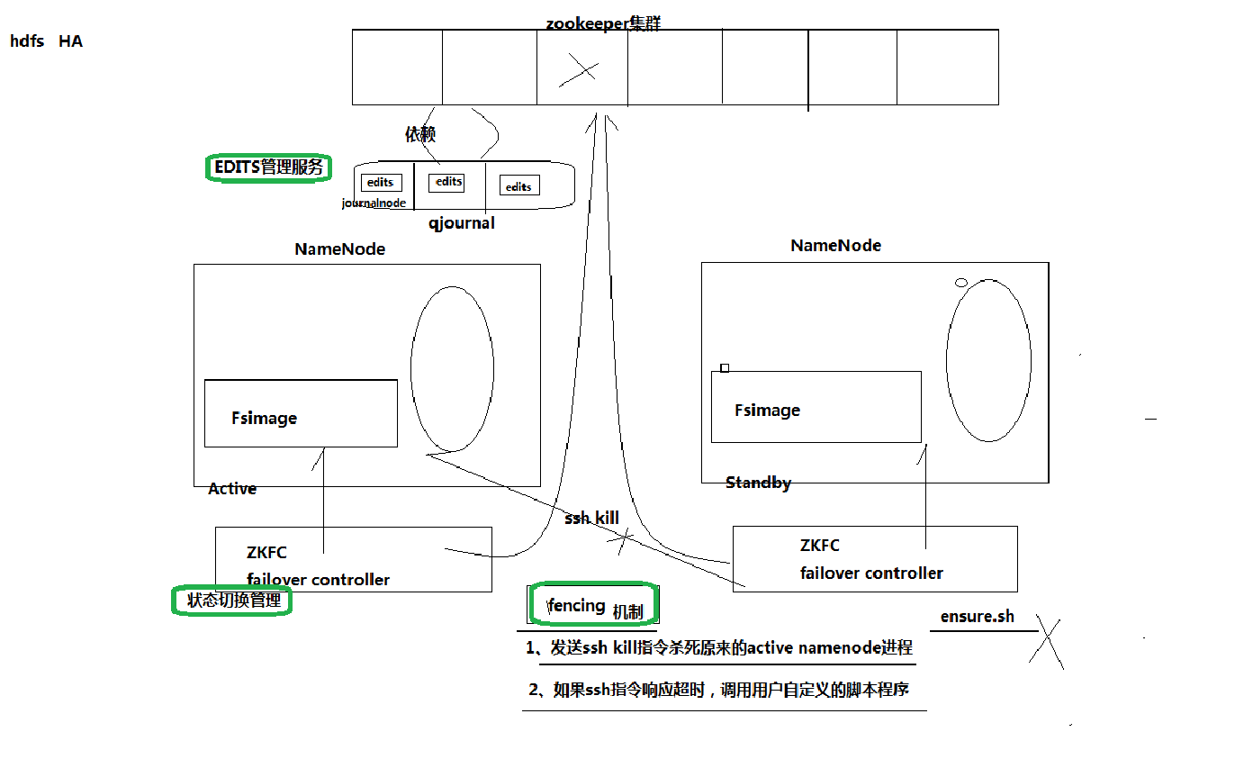 为防止这种情况的出现,ZKFC切换namenode时会有一个fencing 机制来保证原active状态的namenode一定不会再次激活