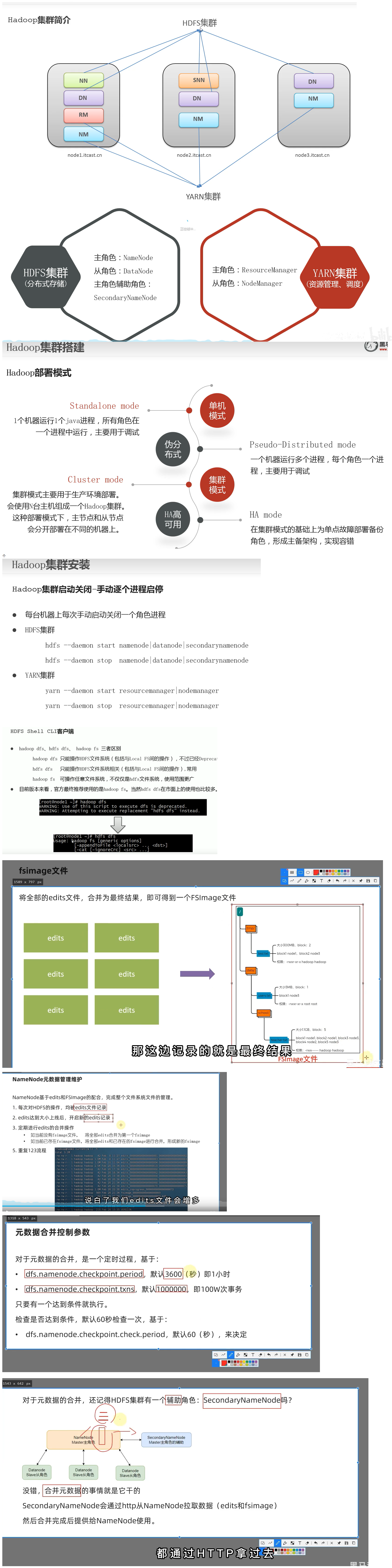 edits log条数达到触发条件,运行Secondary NameNode的checkpoint操作。Secondary NameNode通知namenode切换edits log文件。即namenode此刻采用一个全新的edits.new文件进行读写Secondary NameNode通过http下载namenode中旧的edits log文件和硬盘元数据(Fsimage)Secondary NameNode通过edits log的日志信息,生成新的元数据文件(Fsimage.chkpoint),并传给namenodenamenode用Fsimage.chkpoint和edits.new替换旧的元数据文件和edits log文件提供真实文件数据的存储服务,定期向Namenode发送心跳信息,汇报本身及其所有的block信息,健康状况