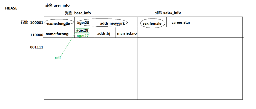 HBase介于NOSQL和RDBMS之间,同RDBMS一样,它也是用表结构存储数据,表结构主要由Row Key(行键),列族,Cell,时间戳 组成: