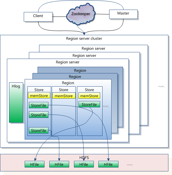 HMaster:为Region server分配region;负责region server的负载均衡;发现失效的region server并重新分配其上的regionRegion server:维护Master分配给它的region,处理对这些region的IO请求。即负责读写表数据Region:HBase中分布式存储和负载均衡的最小单元,分布在不同的HRegion server上。实质为在行的方向上分割为多个Hregion。客户端访问某个表的"xx行键-xx列族-xx字段名-xx版本号"数据时,通过Zookeeper中的信息访问对应的元数据表,知道数据存储在哪台Region server中,然后对应Region server读取存在HDFS中的数据返回